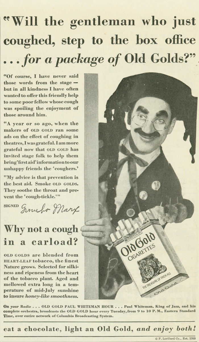 Comedians – img41377 May 25, 2021 by sutobacco Download imageTheme:Movie StarsCollection:ComediansBrand:Old GoldManufacturer:P. LorillardFormat:AdvertisementTobacco Type:Cigarette