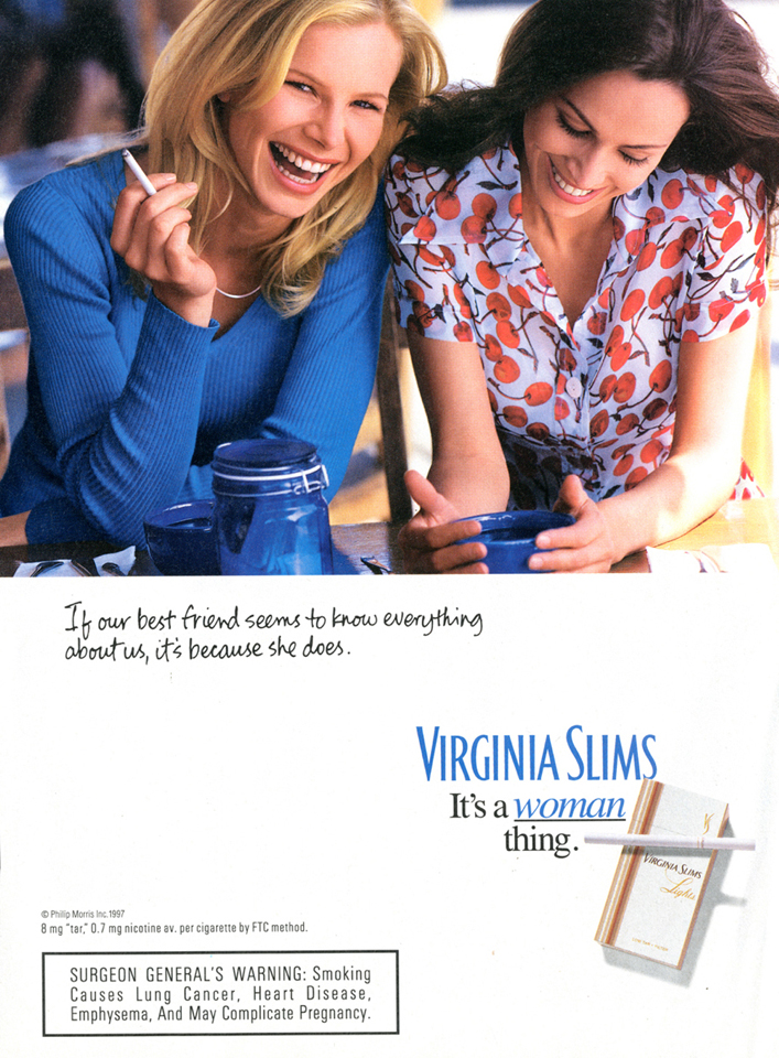 Virginia Slims Modern Ads – img45482 May 25, 2021 by sutobacco Download imageTheme:Women's CigarettesCollection:Virginia Slims Modern AdsPublished:1997Brand:Virginia SlimsManufacturer:Philip MorrisFormat:AdvertisementTobacco Type:CigaretteKeywords:Female, Health, lights, Slims, Weight