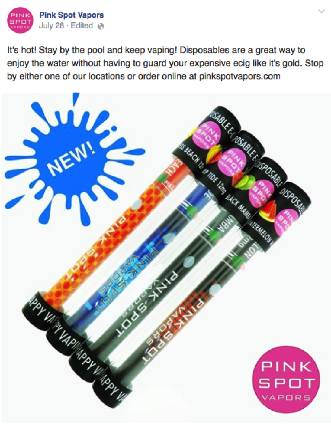 Packs & Boxes – img24615 June 2, 2021 by sutobacco Download imageTheme:eCig DesignsCollection:Packs & BoxesPublished:2012Brand:Pink Spot VaporsManufacturer:Pink Spot Vapors, Inc.Format:AdvertisementTobacco Type:eLiquidQuote: