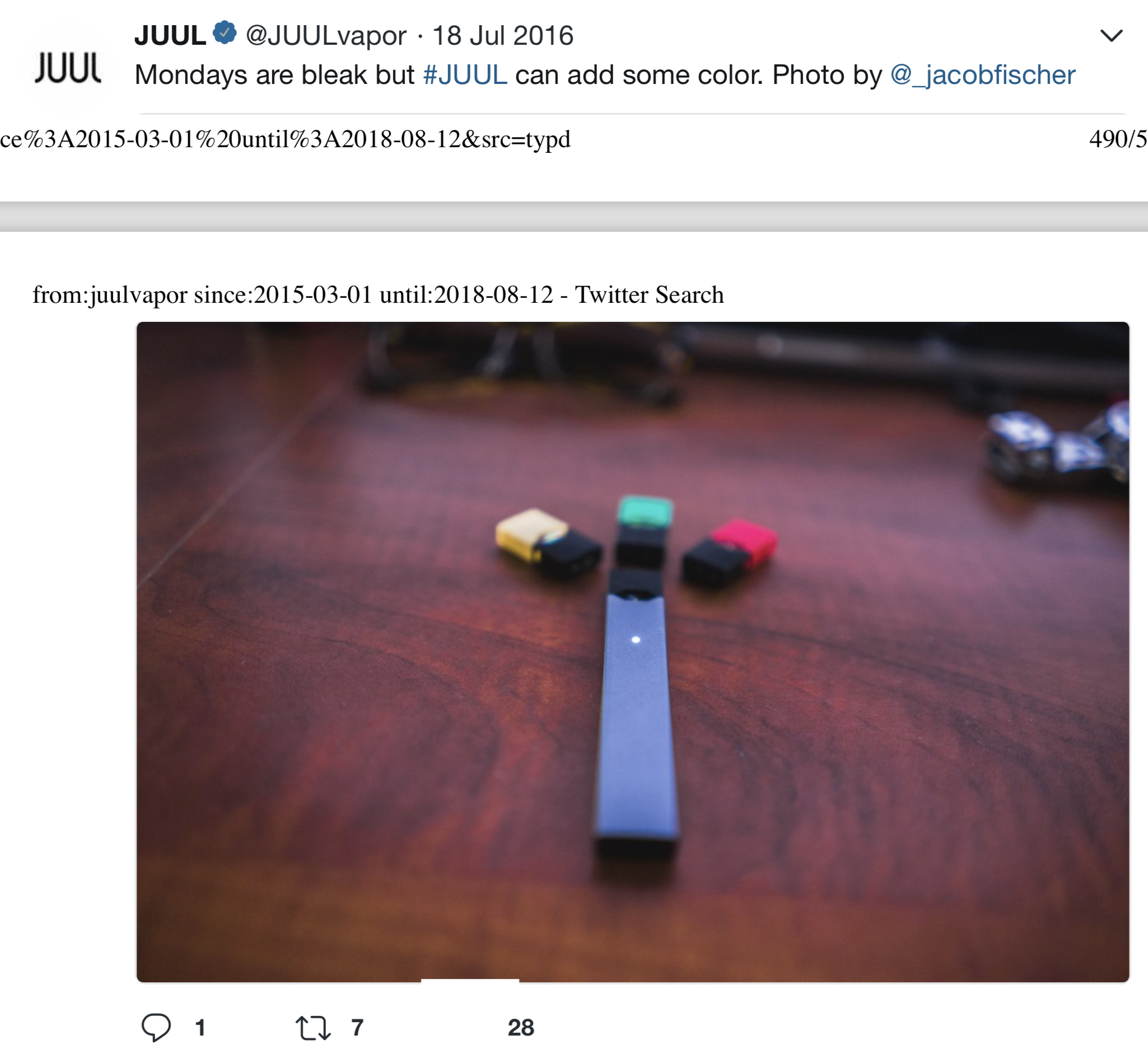 Twitter – img37990 April 21, 2021 by Download imageTheme:JUULCollection:TwitterPublished:2016Brand:JUULManufacturer:JUUL Labs, Inc.Format:Web ImageTobacco Type:Electronic Cigarette